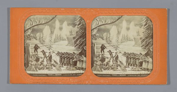 Curator: At first glance, the entire diptych comes across as quite dreamlike and ephemeral, wouldn't you agree? The almost monochrome palette emphasizes a focus on line and form. Editor: Indeed. This is "Scène uit Assepoester," or "Scene from Cinderella," created by Charles Dauvois in 1867. It's particularly fascinating as a stereoscopic card. Consider that Dauvois, though somewhat obscure now, was deeply embedded in the cultural milieu of the Second Empire. Curator: Absolutely. Examining this as an artifact of material culture, the specific use of stereoscopic cards to depict a widely loved story aimed at mass consumption is interesting. It provided a novel method for the rising middle class to own art depicting theatrical experiences. Note the elaborate set design mimicked here—miniature sets! Editor: The theatre connection is significant, transforming a familiar narrative into a consumable spectacle, reproduced on photographic paper. One can only wonder about the workers employed in mass-producing these cards. What was their relationship to this imagery, and to the rising popularity of theatrical narratives? Curator: Furthermore, the stereoscopic card served as both documentation and popularization. Consider, the creation process would have been intricate. Dauvois likely sculpted and assembled miniature set pieces and characters. I imagine labor divided across a small workshop. What’s truly remarkable is how he translated a complex theatrical presentation into something accessible for domestic consumption. Editor: Agreed. And don’t underestimate the implied societal message within. It solidified accepted codes of conduct and highlighted particular roles in culture—princes and potential brides. And it democratised elite theatre. But how much choice were workers afforded in how they worked on these images and did they participate in this consumption of theatre themselves? Curator: Good point. I think both the beauty and the social factors surrounding "Scene from Cinderella" make this a fascinating artifact, and a unique example of its type. Editor: I agree wholeheartedly. Hopefully, this will allow viewers to explore how mass production played a crucial part in creating a fantasy in people’s domestic life and social structure.