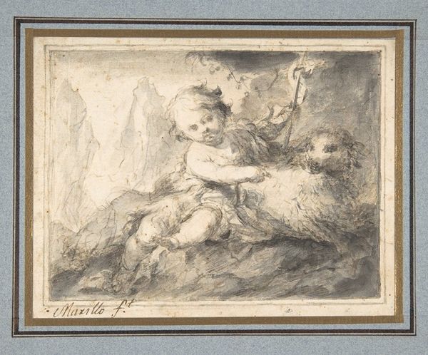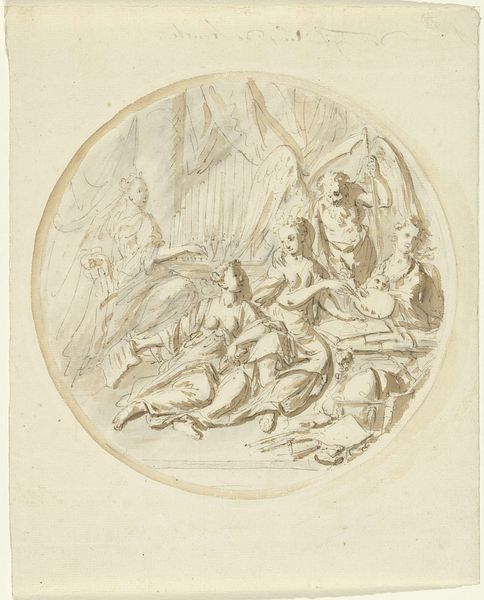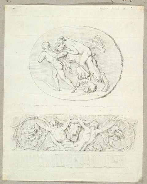 Curator: This is Edward Francis Burney's "Dance of Death: Vignette," held within the Tate Collections. Look closely at the artist's delicate use of line and form. Editor: What strikes me immediately is the prevailing mood. It is a somber dreamscape, with the grim reaper looming. Curator: Indeed. The composition, especially within the oval format, creates a sense of contained drama. Note how the figures are arranged in relation to the tomb or altar. Editor: The figure of death, the reclining figure, the woman placing flowers – it's all very allegorical. Could this be a memento mori, a reminder of mortality? Curator: Perhaps. Burney often used imagery from literature and theatre, so it could be an interpretation of a specific text. Editor: Ultimately, the sketch serves as a meditation on life and death, rendered with surprising delicacy. Curator: Precisely. The formal constraints enhance its emotional impact.