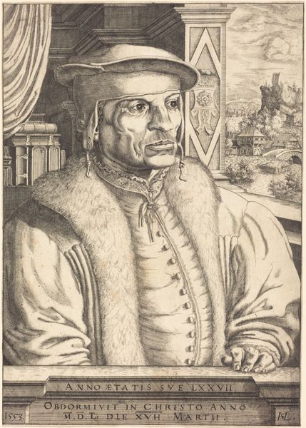 Editor: So, this is Albrecht Dürer's "Portrait of Ulrich Varnbüler," an engraving from 1522. It feels quite formal and serious, doesn't it? There's almost a weightiness to his gaze. What strikes you most when you look at it? Curator: The inscription in the image itself tells much about its deeper significance. The text acts as a symbolic frame for Ulrich, immortalising his achievements and status. Think of the hat itself. This isn’t just any head covering. It’s a carefully constructed symbol of Varnbüler's civic role and, indeed, his authority. Notice its texture, rendered in precise lines. What does this attention to detail suggest about Dürer’s intentions? Editor: That Dürer wanted to showcase not just Varnbüler himself, but also his position in society, the details contributing to the overall impression of power? Curator: Exactly! Dürer captures not only Ulrich's likeness but the essence of his standing within the community. The inscription acts as an allegory; perhaps Varnbüler had this to show his importance in a very public and obvious manner. It is fascinating how cultural memory gets imprinted through images such as this, with even clothing carrying symbolic weight across generations. What is power to you in the 21st Century? Editor: Hmm, in this case, I guess it’s subtle; maybe now is the time of understatement. It’s incredible how much a seemingly simple portrait reveals about social structures. Curator: Indeed. And about the enduring human desire to leave our mark. The picture carries psychological power over the ages. What an amazing insight!
