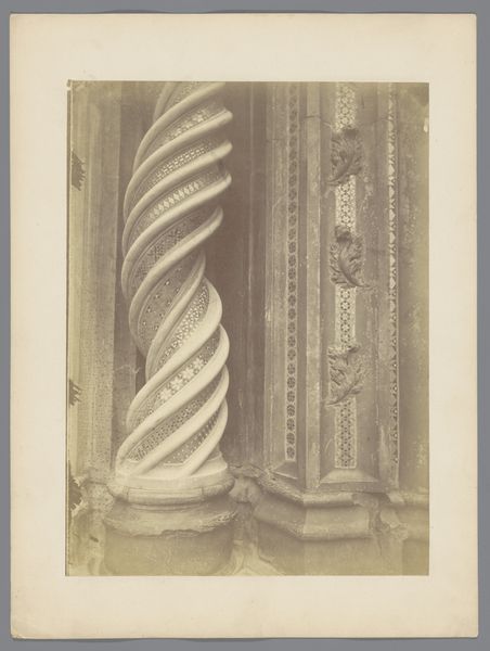 Editor: This is an albumen print dating from between 1850 and 1900 by Adolphe Giraudon. It’s titled "Noordelijke ingang van de Saint-Pierre in Aulnay," depicting the entrance of a church. It’s so detailed! What's striking to me is how this Romanesque architecture, once a symbol of religious authority, is now presented and consumed as a photograph, a commodity. What do you make of this photograph? Curator: You’ve hit on something crucial there. The photograph does not merely *represent* the church; it transforms it into a visual artifact ready for circulation. Consider the cultural role of these photographic reproductions in the late 19th century. They became increasingly popular due to the rise of tourism. Churches, previously at the center of community life, began to be viewed as monuments, destinations. Editor: So, is Giraudon commenting on that shift? Or simply documenting it? Curator: I think it’s likely a combination. Photography allowed for widespread documentation of architectural styles and techniques previously only accessible to local people or scholars who travelled great distances to examine them firsthand. What choices do you think Giraudon made, from framing to exposure, that might shape how we *consume* this monument today, in our post-industrial moment? Editor: I suppose that by cropping out much of the surroundings and focusing so intently on the entrance, the artist directs our gaze – and perhaps even elevates it. I can really appreciate Romanesque architecture. Before photography, it might’ve felt less accessible. Curator: Precisely. Giraudon’s photograph encapsulates a crucial shift: the democratization of art and architectural experience. The print allowed this church’s image, imbued with history, spirituality, and architectural innovation, to enter private collections. Editor: It's fascinating to see how this artwork captures a moment of transition in art consumption and accessibility! Thanks. Curator: Indeed! Considering the history and societal factors surrounding the photograph reveals its depth.