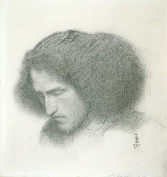 Curator: Gosh, what strikes me immediately is the wistful expression on his face. He seems almost melancholic. Editor: Indeed. This is a pencil study created in 1849 by Sir John Everett Millais, for the head of Ferdinand in his painting 'Ferdinand Lured by Ariel'. Curator: 'Ferdinand Lured by Ariel'— Shakespeare’s Tempest, right? No wonder he seems haunted! That play bubbles with magic, deception, betrayal. The subtle shading Millais achieves with just pencil is remarkable. Look at the way light catches the planes of his face. Editor: Absolutely. Notice the careful detail in the rendering of his hair, yet the almost ethereal quality of the rest of the sketch. It's a contrast. It really pulls you into the subject’s inner world. We see how Ferdinand is drawn toward an ethereal, perhaps dangerous illusion. Curator: I think you’ve hit it, I’m now thinking that faraway gaze of his tells us more than any fully fleshed-out painting ever could. Studies can feel so intimate. Editor: Millais, along with others, co-founded the Pre-Raphaelite Brotherhood just the year before this study. They often looked to literature for inspiration, finding symbolic and psychological depth within narrative. The choice to fixate upon Ferdinand from the play The Tempest can then easily be understood. Curator: So much raw emotion conveyed with just a few lines, really impressive. Knowing it's a preliminary study kind of illuminates something more potent. Editor: Yes, I find myself drawn to how symbols are born, developed, and layered across a cultural memory; Millais offers such a revealing moment in the creation of such symbolism, which remains vibrant through our continuous retelling and resignifying. It feels like a privilege to witness. Curator: Agreed. He captured so much with such elegant simplicity. This drawing—it lingers. Editor: Precisely. It stays with us, urging introspection on the lure of beauty and what we stand to lose as a result.