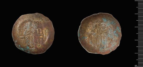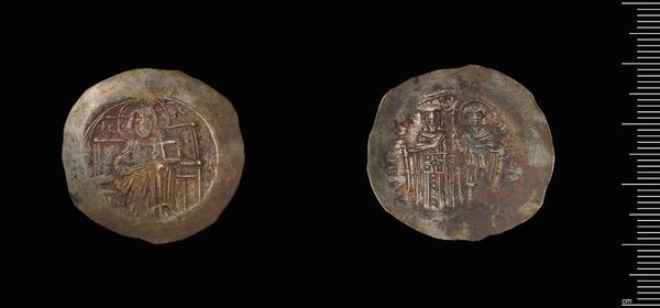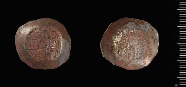 Editor: So, this is a Trachy Type B of Theodore I from Nicaea. It's a tiny coin and looks like it might be made of silver. What do you make of it? Curator: For me, it whispers of power and impermanence, doesn't it? The delicate impression, the wear and tear… it speaks to the fragility of empires, the human touch on history. What do you think about the imagery? Editor: I see what looks like religious iconography and some kind of ruler, maybe Theodore himself. Does it hold any messages for us today? Curator: Absolutely. Each symbol was carefully chosen. It’s all about legitimacy, divine right, and projecting an image of strength. It's fascinating to think about what people valued then, and how we value them now. Editor: Seeing history in your palm—that’s what I’ll take away. Curator: Me too! A tiny window into a vanished world.