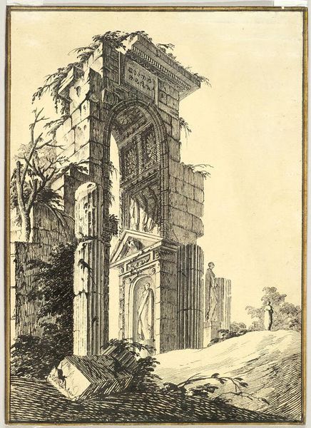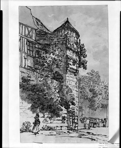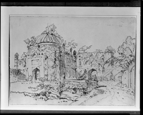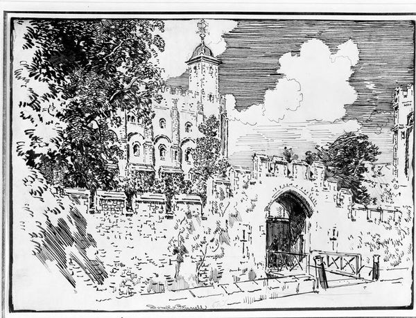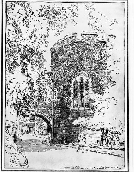 Editor: Joseph Pennell's "The Entrance Gate Way" presents this imposing architectural structure. The contrast of light and shadow really emphasizes its grandeur. What do you see in this piece? Curator: I see a visual representation of power and exclusion. The gate serves as a barrier, a physical manifestation of privilege. Pennell, working during a period of intense social stratification, invites us to consider who is granted access, and who is denied. Editor: So, the gate isn't just an entrance; it's a social statement? Curator: Precisely. Consider the figures lingering outside—are they welcome inside, or are they relegated to the periphery? The artist prompts us to question the systems that create such divisions. Editor: That gives me a lot to think about. It is more than just an architectural study; it's a challenge. Curator: Exactly! Art can hold a mirror to society, revealing uncomfortable truths about power dynamics.