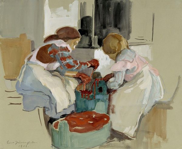 Editor: This is Dean Cornwell's '"Gad," said Heseltine to Peril, "If the doctor can only keep me going long enough,"' from 1923. It's an oil painting depicting a couple in what looks like a moment of quiet contemplation. There’s almost a palpable sense of melancholy, or perhaps weariness, about the male figure. How do you interpret this work? Curator: The weariness you sense is key. Beyond the immediate portrayal of leisure, I see a commentary on societal expectations and anxieties following the First World War. The man's pose and the woman's almost detached gaze hint at the psychological toll of a generation grappling with disillusionment. Consider, too, the context of modernism; how does Cornwell challenge or reinforce conventional gender roles of the era through the figures' relationship and positioning? Editor: That's interesting. I hadn't considered the post-war context so directly. I was more focused on the domesticity of the scene, the interior space. Curator: And that domesticity itself can be interrogated. Is it a safe haven or a gilded cage? Note the sharp blue in the woodwork, a colour which appears otherwise only on the tray and a book on the floor, what could it signify? We should look for symbolism in every colour, every gesture. The title implies there's an outside force—a doctor—that could determine destiny. How might class, privilege, and access to healthcare play a role in this narrative? Editor: I see what you mean. The title complicates the scene; there's more going on than meets the eye. Maybe that weariness isn't just personal, but a symptom of a larger societal unease. Curator: Precisely! Art becomes a powerful tool when we understand its layered connections to history, politics, and social structures. Examining who is included, who is excluded, and whose story is being told, can push us to question the world we inhabit today. Editor: Thank you for expanding my perspective. I'll definitely consider the broader historical and social implications in future encounters with art. Curator: A deeper understanding comes through constant inquiry.