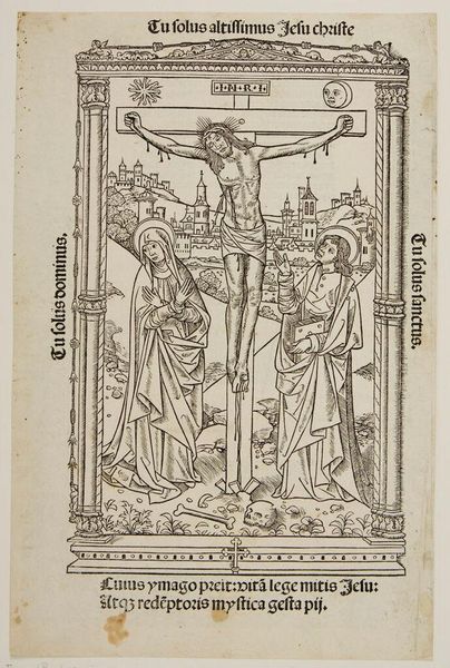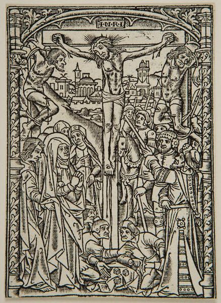 This woodcut of the Crucifixion was made by an anonymous artist in the fifteenth century. Its stark black and white lines would have been highly reproducible, and images like these were often used in religious instruction. Although the scene is set in Jerusalem, its visual language is clearly European. The Roman soldiers standing to the right wear medieval armor and carry spears. To the left, the Virgin Mary and other mourning women are also dressed in the fashions of the day. The angels at the top and the devilish figure at the right represent the spiritual battle being fought. In this image, familiar religious themes become woven into the social fabric of the time. To understand this work better, we might consider the history of printmaking and the ways these images were circulated, sold, and used in religious practice. Considering the historical context helps us understand the enduring power and cultural work performed by this humble yet moving image.