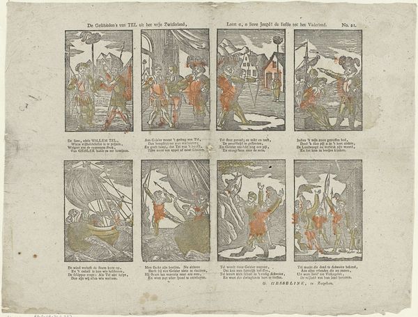 Editor: We're looking at "The History of the Swiss William Tell" by Christiaan Jacob Schuyling, made between 1820 and 1838. It’s a print, seemingly an engraving, showing different scenes. It reminds me of a comic strip, almost telling a story panel by panel. How do you interpret this work in its historical context? Curator: Well, the “comic strip” comparison is quite apt. Schuyling’s engraving speaks to the popularization of history and folklore during the 19th century. Consider how the narrative itself, William Tell’s defiance against oppression, resonated with emerging nationalist sentiments in Europe. The choice of a widely accessible print medium is significant too. It moves history out of the realm of elite paintings and into a form consumed by a broader public. Editor: So, the medium itself becomes a statement? Curator: Exactly! Prints like this served to disseminate and solidify national myths, visually encoding stories that bolstered a sense of collective identity. Think about where this would have been displayed - perhaps a middle-class home or a public space? Its accessibility helped shape and reinforce a certain narrative of Swiss history and national character. Editor: The figures seem somewhat… stiff, not very naturalistic. Does that style have a purpose? Curator: Indeed. These aren't high-art renderings aimed at capturing lifelike realism. This stylistic choice aligns with folk art traditions, emphasizing clarity of storytelling over aesthetic finesse. Remember, its purpose isn't to emulate academic painting; it's to communicate a powerful narrative in a way that's legible and engaging to a broad audience. This deliberate aesthetic choice further grounds the heroic narrative in the sphere of common identity and social belonging. It helps to define what and whom this piece is *for*. Editor: I never considered how even the style could play a part in shaping national identity. I see this print very differently now! Curator: Precisely. By considering its context and function, we gain a deeper understanding of the work's impact on how the Swiss people imagined themselves.