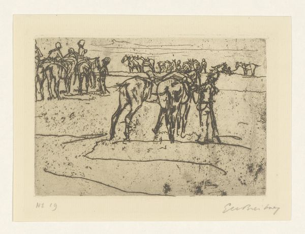 Camille Pissarro created this etching, "Impressions of Rain, Rouen," using a metal plate, likely copper or zinc, and strong acid. The image's atmospheric quality stems directly from the etching process. Pissarro would have coated the plate with a waxy, acid-resistant ground, then scratched his design into it, exposing the metal. Immersing the plate in acid would bite away at these lines, creating grooves that hold ink. The depth and darkness of the lines depend on the duration and strength of the acid bath, creating a range of tones. The wiping of ink, the pressure of the printing press, and the absorbency of the paper, all influence the final image. This print captures a slice of modern urban life, with laborers and horses on the rain-slicked streets of Rouen. Consider the labor involved: not only the artist's, but also the work of the figures depicted, the working class who powered the industrializing city. Pissarro's embrace of printmaking democratized art, making it more accessible to a wider audience, a move aligned with his social consciousness.