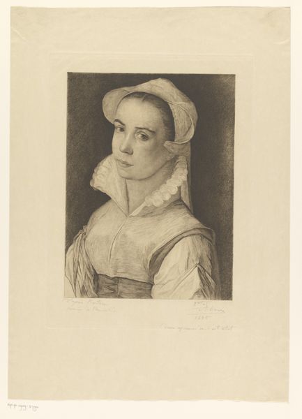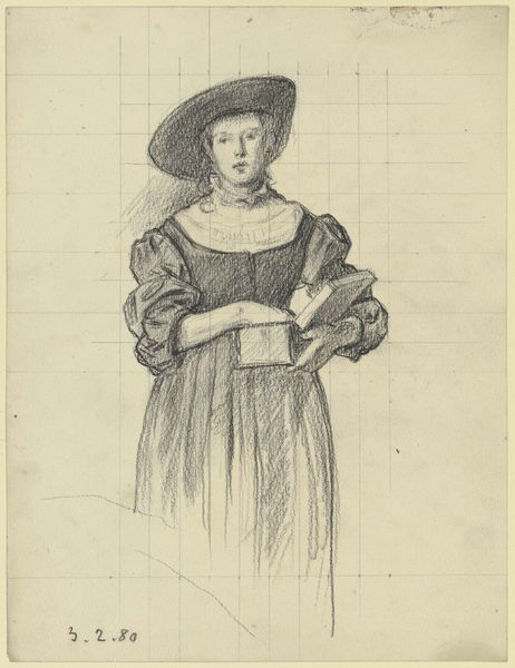 Otto Scholderer created this graphite drawing entitled "Portia aus der _Vorbereitung zum Kostümball_" currently held at the Städel Museum. The drawing presents a figure with soft yet definite lines that define form and space. The face, framed by a wide-brimmed hat, is delicately rendered, evoking a sense of introspection. The loose, expressive strokes describing the clothing add a dynamic quality to the composition, hinting at movement and transformation. Scholderer's use of graphite isn't merely representational; it is an exploration of texture and tone that invites us to consider the artwork's semiotic function. The costume, a signifier of identity and role-play, opens up a discourse on performance and self-construction. It is an invitation to decode the visual language of dress, a language that negotiates the boundaries between the individual and society. The drawing destabilizes the fixed identity and underscores the performative aspects of social roles.