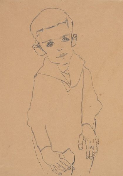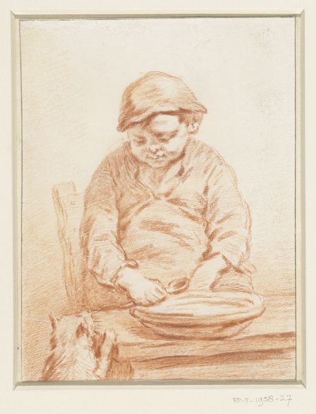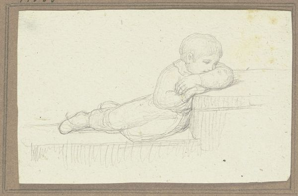 Curator: Immediately striking, isn't it? The quietude. Editor: Indeed. It reminds me of early photographs. I'm sensing the texture even from here. Tell me a bit more about it. Curator: This is a pencil drawing by Christen Købke, created between 1844 and 1847. The title translates to "The Artist's Son Peter, Full Figure, Sitting with an Animal or Toy". It’s currently held at the SMK, the National Gallery of Denmark. Editor: "Animal or Toy," you say. So interesting. Note the visible tooth of the paper—Købke opted for something readily available. How does the socio-political context shape this image? I imagine access to art supplies at this time informed the way an artist approached their subjects. Was pencil, in particular, a choice guided by broader social circumstances? Curator: Absolutely. Pencils became more widely accessible around this period. Furthermore, Danish Golden Age painting was strongly connected with middle class identity. Therefore, Købke likely made such works both for artistic reasons and to display the kind of domestic comfort in which his middle class patrons would partake. Editor: His son becomes both the subject and perhaps also the recipient, blurring art and the everyday experience of fatherhood. Do you notice the precise execution and how carefully Købke depicts not only his son's likeness but also, the textures of fabric and even the small stool that holds Peter's weight? What does that level of precise detail tell you about the artist's intent? Curator: The detail speaks to realism—a core tenant of his artistic values and era—but the very medium, a drawing, means it likely was done quickly and efficiently. Time, materials, labor, and the constraints within those aspects inevitably inform both form and the viewer's consumption. We're reminded it is not the man himself, but only pencil. Editor: Yet the image evokes intimacy through artifice, or technique. Ultimately, that might be one of the most compelling attributes on display here. It’s quite a contrast! Curator: The way Købke uses such a modest medium to portray what must have been profound domestic and paternal scenes feels both modern and enduring. Editor: An interesting piece to reflect on!