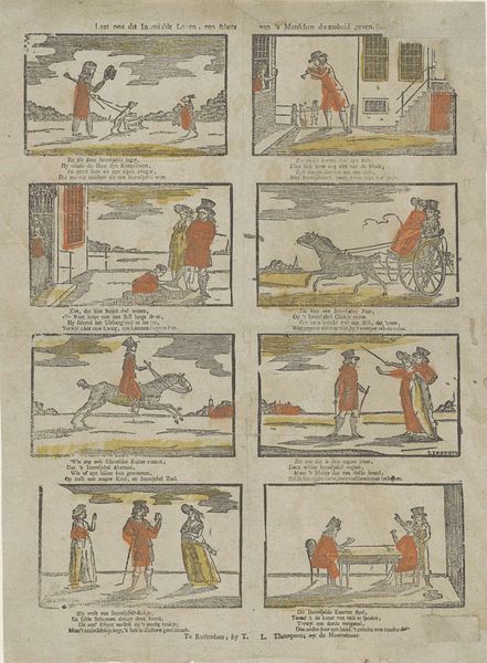 This print, “Laat ons dat incroijable leven, / Een schets van 's menschen dwaasheid, geven,” was created by Glenisson & Zonen to depict scenes of human folly. Note the repeated motif of characters pointing, a gesture laden with meaning. In one scene, a man raises a stick at his dog. In another, a woman points accusingly at a man with a dog. This seemingly simple act echoes through art history. Think of John the Baptist pointing to the Lamb of God, or ancient philosophers gesticulating during discourse. The gesture has evolved, from indicating divine presence to highlighting human error. It becomes a tool for blame, for social correction. The enduring appeal of these scenes lies in their reflection of our own follies. We recognize the absurdity of our actions, mirrored in these figures. The act of pointing, then, taps into our collective memory of judgment and self-awareness. It is a stark reminder of our own imperfect natures, cycling back through time.