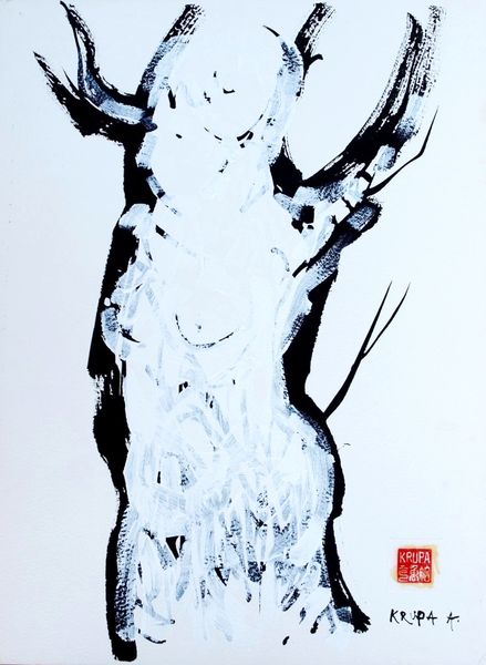 Alfred Freddy Krupa made this ink drawing titled 'While Fixing Hair' using brushes and ink. The image is so immediate and confident; just a few strokes and you know exactly what you are seeing. The thing with ink is that it flows. It has a mind of its own, and Krupa really lets it do its thing here. Like that big stroke that defines the figure's left side – it’s dark and concentrated at the top, then thins out and drips, and fades away. This feels spontaneous, like the ink is guiding the artist as much as the artist is guiding the ink. I am reminded of Franz Kline. Both artists share a love of gestural abstraction, finding ways to suggest forms and figures without needing to represent things literally. But where Kline's works can feel monumental and epic, Krupa's drawing is intimate, as if glimpsed in a mirror. There’s a real tension between control and chance. I like that.