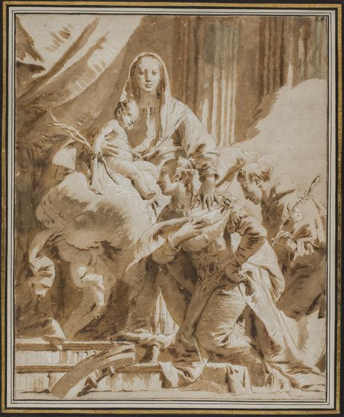 Simone Peterzano made this drawing called "Study for the Pentecost" in Italy, sometime in the late 16th century, using pen and brown ink with brown wash on laid paper. Peterzano worked in Milan when it was under Spanish rule, so his art reflects both Italian and Spanish cultural influences. The Pentecost is a key event in Christianity when the Holy Spirit descended upon the Apostles. The drawing shows them gathered together, receiving divine inspiration. In the context of its time, this image resonates with the Catholic Church's efforts during the Counter-Reformation to reaffirm its authority and traditions. The focus on divine intervention can be seen as a push to strengthen religious belief and solidarity within the community, but also as a defense against the rising tide of Protestantism. To better understand this drawing, art historians study Peterzano’s biography as well as the religious and political history of Milan. This helps us appreciate how the art reflects the complex interactions between artistic expression, religious institutions, and cultural change.