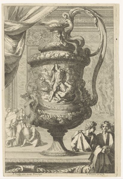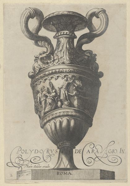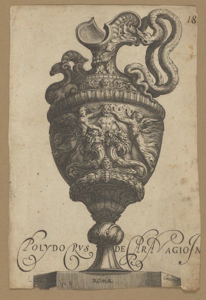 Editor: Here we have Aegidius Sadeler II's print, "Plate 8: Vase or Ewer Decorated with a Satyr Figure..." from 1605. It looks like an image of a vase, maybe meant for holding wine. All the figures decorating the surface give a celebratory, slightly chaotic vibe. What strikes you about this piece? Curator: What intrigues me is the labor involved in translating something three-dimensional into a two-dimensional print. Look at the textures, the way the artist meticulously renders the curves and the ornamentation of the vase. It points to the commodification of antiquity—prints like this made classical forms accessible, turning art into a consumer good. Editor: A consumer good? I never thought of it that way! So you're saying the print, itself, becomes a kind of object or commodity? Curator: Exactly! Consider the role of the engraver, Sadeler. He's not just copying; he's interpreting and marketing classical forms to a wider audience. This process divorces the form from its original elite context and places it within a new circuit of exchange, potentially influencing tastes and styles in workshops across Europe. How do you think its original audiences engaged with this imagery of opulence and classical reference? Editor: It is interesting how a print like this could democratize design. But what about the original vase? Did its materials communicate something different that the print couldn't capture? Curator: Precisely! The vase itself, likely made of precious metals or stone, signaled wealth and status in a very immediate, tactile way. The print, on the other hand, abstracts that materiality. The value shifts from the object itself to its reproducible image, democratizing access but altering the experience. Editor: So it’s about the change in function as much as appearance – one is for use, the other for distribution of visual language! That makes me see this print and, really, art from that period, in a completely different light. Curator: It becomes not just an image but an indicator of shifting social and economic forces within art making.
