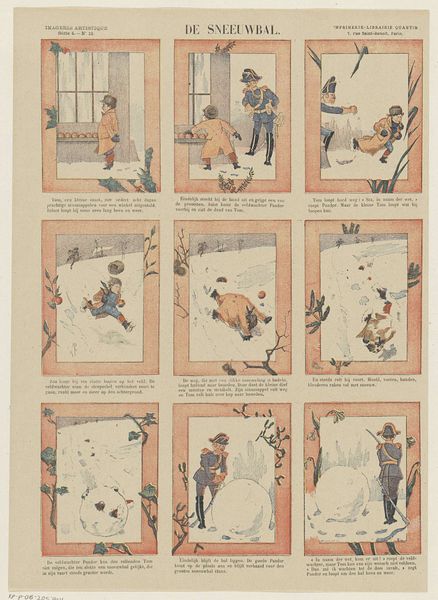 Curator: "Ijsvermaak," or "Ice Entertainment," is a delightful chromolithograph produced sometime between 1875 and 1903 by Jan de Haan. Editor: My immediate impression is pure winter cheer. The scenes feel quaint, with a lovely interplay of color across the panels that really brings a sense of joy to this depiction of various people enjoying an outdoor setting in snowy weather. Curator: Yes, the arrangement of these vignettes really highlights the role of winter leisure in late 19th-century Dutch society. You can see families together, children playing, and skaters showing off their skills. It all conveys a specific social atmosphere—one of relative comfort and availability of leisure time. This print, part of a series aimed at children, also communicates very specific cultural norms around play. Editor: Indeed, each of the individual compositions uses strong horizontal lines which contribute to a sense of stasis. But this is offset by dynamic diagonal elements within each scene—think of the skaters, or the kids playing in the middle scene. It creates a charming contrast and really holds my attention. Curator: And I think that tension is at the heart of genre paintings like this. They’re depicting these seemingly straightforward, happy moments, but beneath that, there are often unspoken assumptions. Who has access to this leisure? What does it mean to represent this kind of scene at a time of broader social change? These images did not exist in a vacuum; these representations shaped perspectives on appropriate behaviour and values. Editor: Absolutely. Looking at the textures, too, there's an interesting contrast between the smoothness of the ice and the rougher textures used for the snow-laden trees and architecture, don't you think? These varied textures really give depth to an otherwise quite flat composition of printed pigments on paper. Curator: Exactly, the formal techniques always operate in relation to how it gets framed within particular social constructs. How the scenes and materials come to function culturally is important in an analytical viewing, I think. Editor: Well, I appreciate this little journey through "Ijsvermaak." It's fascinating how an image so seemingly simple can spark such multifaceted views. Curator: Agreed. It is just as interesting to observe the painting's structure as the period context and how it circulated. A complete understanding considers both viewpoints!