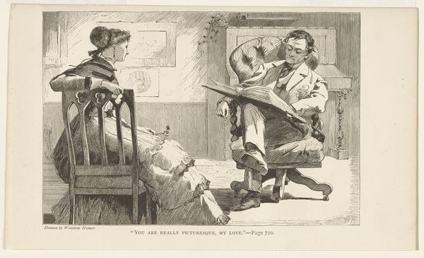 Johan Michaël Schmidt Crans created this print about the Ministry of Marine in 1866 using ink on paper. At first glance, the eye is drawn to the central figure of a craftsman standing beside a makeshift anvil fashioned from an office chair. Upon it rests a massive, book-like object labelled "MARINE." The piece is dominated by its intricate linework, creating a sense of depth and texture. The composition uses the atelier of the artisan to suggest a broader commentary on labor and value. The oversized book-form, rendered with sharp lines and careful shading, transforms into a satirical symbol of the Ministry. It is not a book but a shield and a container to be armored. Crans cleverly uses form and context, shifting between the literal and the symbolic. The seemingly banal image of labor becomes a pointed critique through these visual cues. What does it mean to represent a governing body as something requiring heavy construction and protection? It asks us to consider the intrinsic connection between form and meaning in political discourse.