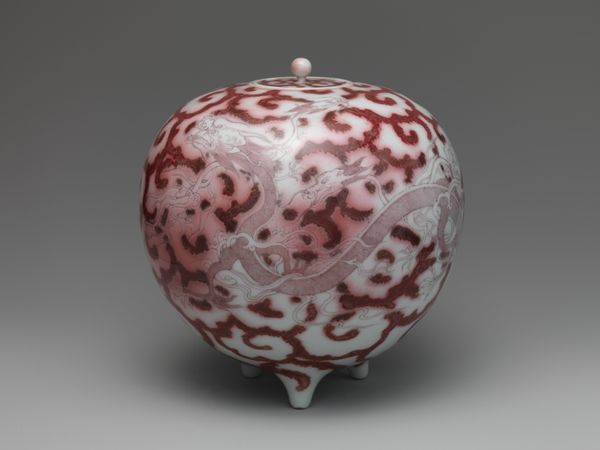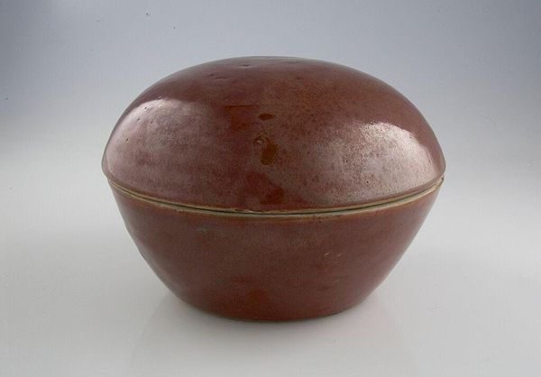Curator: Here we have a "Water pot" made during the Qing Dynasty, specifically during the period between 1662 and 1722. This ceramic piece resides here at The Met. Editor: Wow, what a serene little thing! The colour's so muted and calming. Almost like a blush of dawn captured in clay. I want to touch it. Curator: Let's begin with the object's structure. Note the simplicity of form: a hemispherical body surmounted by a subtle aperture. The smooth curve invites contemplation of the void it contains and reflects. Editor: It’s more than the form, isn’t it? Look at how light plays across that pink surface. The curves almost… breathe. It is a very still object but there's hidden movement. Like a thought barely formed. Curator: Observe the monochromatic glaze. This wasn’t a splash of color but it achieves harmony through carefully regulated intensity and hue, drawing focus to minute textural nuances that emerge in relation to the light source. The restraint adds visual complexity. Editor: I love that the only embellishment appears to be swirling cloud-like figures, ever so subtly incised and barely visible, as if dreaming into being, right beneath the blush pink of the ceramic itself. It's poetry. Curator: We see here what some theorists term a 'dialogue' between object and space: how can function manifest in aesthetic refinement. Editor: The refinement itself IS the function, isn't it? It's purpose might simply be as a focal point for meditative contemplation rather than to strictly hold water! It asks you to slow down, doesn’t it? Curator: Perhaps it’s true purpose exists in this very synthesis of form, color, and embedded visual symbolism. Editor: It seems so simple. I bet the creator labored lovingly, thoughtfully on something that invites reflection. It is really a lovely thing. Curator: A work designed, executed, and now beheld with intention. Editor: Well, put, let's go have some tea!