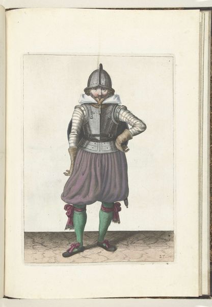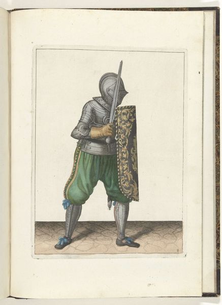 Adam van Breen made this print of a soldier with shield and rapier in 1618. It gives us a glimpse into the military culture of the Dutch Republic during the early 17th century. This image isn't just a portrait; it's a demonstration of a specific combat stance, one of a series. The detailed depiction of armor and weaponry speaks to the period’s preoccupation with military readiness, reflecting the ongoing Eighty Years' War. Consider the role of the artist here. Was van Breen commissioned by military institutions to create a visual manual? Or was he responding to a broader cultural interest in martial subjects? Studying military manuals and the broader publishing market of the time, we might start to understand how knowledge was circulated, and how the role of the artist was changing. The meaning of this print lies in its relationship to the society that produced it.