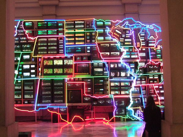 This sprawling installation by Jason Rhoades presents a web of neon signs and hanging objects. The assemblage offers a window into the artist's stream of consciousness and his critique of consumer culture. Made in the United States, the piece reflects the late 20th and early 21st century’s obsession with brand names and celebrity culture. Rhoades playfully subverts the authority of language and mocks the art world's obsession with originality. He uses neon, a medium typically associated with advertising, to create a visually chaotic environment that challenges our perception of meaning and value. The use of neon is a visual shorthand for Los Angeles car culture, as well. To fully understand Rhoades' work, one must delve into the artist’s biography and also the history of assemblage and installation art. Rhoades challenges the traditional art institution, presenting a world where meaning is fluid and subject to constant reinterpretation.