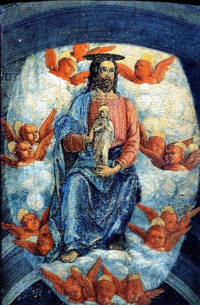 Pietro Perugino painted "Lord in Glory with Angels" using tempera, a technique in which powdered pigments are bound with egg yolk. During the Renaissance, paintings like this were more than just images; they were displays of wealth and power, often commissioned by the Church or wealthy patrons. The process of creating such a work was labor-intensive, involving the grinding and mixing of pigments, the careful layering of paint, and the skilled application of detail. The vibrant colors and smooth surfaces achieved with tempera speak to the artistic skill of the time. The artist uses costly materials, such as azurite for the blues, or gold leaf, all of which were sourced through extensive trade networks. These materials, along with the artist's skill, reflect the social and economic context of the time. Considering the materials and processes used, alongside the social context in which it was created, enhances our understanding and challenges our perceptions of paintings like this.
