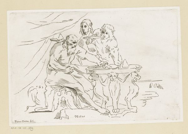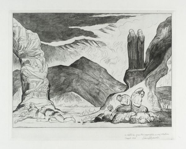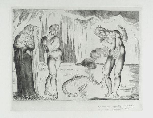 Editor: This is William Blake's "The Six-Footed Serpent Attacking Agnolo Brunelleschi," an etching from around 1826. The frantic energy is palpable! What can you tell me about the process of creating something like this and its impact? Curator: Well, the etching process itself is key. Blake's laborious method of acid-biting the metal plate allowed for detailed lines, creating this intense drama. The printmaking process also democratized access, allowing Blake to disseminate his visions, challenging the art establishment of his time and its reliance on exclusive patronage. Editor: So, the material and process were inherently political? Curator: Precisely. Blake's choice of printmaking was a conscious decision, using readily available materials to create art for a wider audience, independent of the traditional art market. What do you make of that? Editor: That really reframes how I see it. Thanks! Curator: My pleasure! It’s all about understanding the means of production.