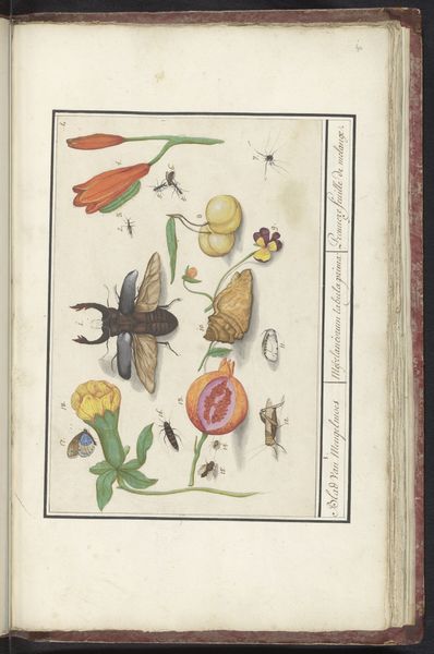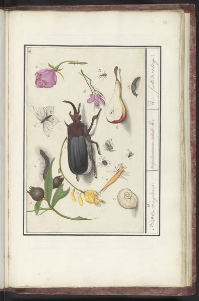Joris Hoefnagel created this watercolor and gouache drawing in the late 16th century. The composition is dominated by an oval frame that corrals a jewel beetle, a plant gall, and a flower. These elements, rendered with scientific precision, invite us into a world of minute detail. Hoefnagel's structured approach to this piece is fascinating. The careful arrangement and detailed execution point towards a specific way of viewing the natural world. We see nature categorized and presented in an almost taxonomic fashion, a common theme during the rise of empirical science. The vibrant colors and meticulous lines, however, elevate the study to something more. Consider the placement of the beetle, gall, and flower: each object is isolated, almost specimen-like, which imposes a structured order to the image. This order encourages us to contemplate the relationship between art and science during the period. The artwork reflects an emerging worldview that seeks to classify and understand the natural world through direct observation and representation.