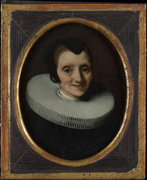 Gerard ter Borch painted this portrait of Johanna Bardoel, wife of Gerard van der Schalcke, using oil on panel. The subdued palette of blacks and whites, set against a muted brown backdrop, draws the eye to the stark contrast of Johanna’s crisp, white ruff. The oval format focuses our attention, creating an intimate yet formal encounter. Ter Borch masterfully plays with textures, from the smoothness of her skin to the detailed folds of fabric. The work exists within a cultural matrix that emphasizes restraint and decorum. The composition, carefully balanced, presents a semiotic language of status and morality. It begs questions such as: how do the formal qualities of portraiture reinforce societal norms, and how does ter Borch negotiate representation, power, and perception within the pictorial space? The formal constraints of the painting invite ongoing interpretation and reflect the complex interplay between artistic expression and cultural values.