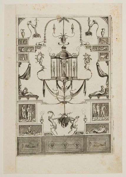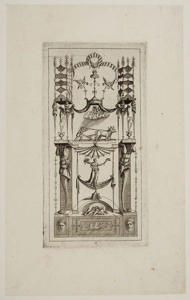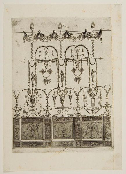 Curator: This is "Decoration X" from an anonymous artist. The precise date is unknown, but it resides in the collection of the Harvard Art Museums. Editor: My first impression is of a delicate, almost ethereal quality. The intricate line work creates a sense of ornate fragility. Curator: Indeed. Note how the composition utilizes symmetry and repetition to create a balanced yet dynamic surface. The use of line, its weight and variation, speaks volumes about the artist’s skill. Editor: This piece likely reflects a specific period of interest in classical motifs and architectural design. Its existence provides valuable insights into the cultural values of its time and the role of ornamentation. Curator: The relationships between line, form, and void create a fascinating interplay of visual tension. Each element contributes to the overall unity of the work. Editor: It really emphasizes how design and ornament were intricately tied to broader social and political narratives. Curator: Precisely. It is a prime example of the power of simple means to achieve a complex, resonant visual effect. Editor: Indeed, and seeing the role and culture of design evolve is worth considering.