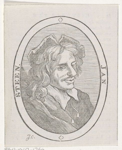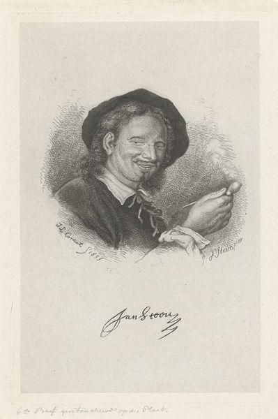 Jacobus Ludovicus Cornet created this portrait of Jan Steen using etching in 1855. Cornet, living in a time of burgeoning national identity, resurrects the Dutch master Jan Steen, known for his genre paintings of everyday life. Here, Steen is depicted with a jovial expression, a pipe in hand, embodying the stereotype of the merry artist. This choice, however, is loaded. Consider the romanticized, almost fetishized image of the artist, often male, white, and associated with leisure and genius. How does this portrayal reinforce or challenge those notions? This image invites us to consider the construction of artistic identity and the weight of history. While seemingly a light-hearted tribute, it subtly engages with questions of cultural heritage, artistic legacy, and the narratives we construct around the artists we celebrate. It reminds us that representation is never neutral.