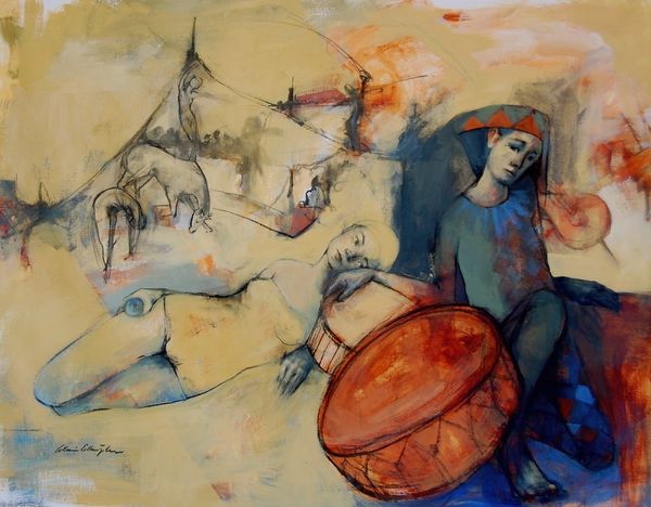 Editor: This is Victor Palmov's "Willage. Horse Taming," painted in 1927, using oil paints. The bold use of color really strikes me – especially that vibrant red horse. What can you tell me about this painting? Curator: Notice the visible brushstrokes and the thickly applied paint. This points to the artist's active engagement with the materiality of the medium. Consider how the pigment itself conveys meaning, specifically, the implications of readily available paint for representing this scene of rural life. It suggests a shift in art production – from scarcity to relative abundance of materials. How might the accessibility of these materials reflect broader changes in the economic landscape of the time? Editor: That's a perspective I hadn't considered. So, you're saying the Fauvist style connects to the socioeconomic context? The painting isn't just a representation, but it also embodies the means of production of that era? Curator: Exactly! Think about the depiction of labor. The horse-taming isn’t romanticized; it looks challenging, perhaps even unsettling, with those expressive faces. Doesn't it make you think about the changing role of agricultural labor, as viewed through a materialist lens? Editor: I see. So, by examining the material qualities and the way labor is presented, we can gain insights into the cultural and economic context surrounding the painting's creation. It's not just about the image, but also about how it was made and the conditions of its making. Thank you for the explanation. Curator: Indeed! Paying attention to materiality really does unlock new ways to interpret art.