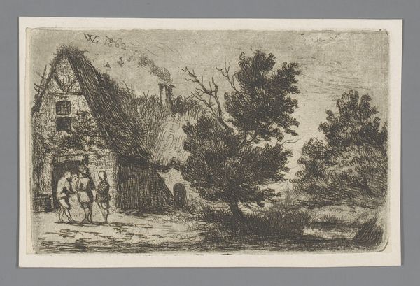 Editor: So, this is "Oude houten huizen in de Ardennen," Old Wooden Houses in the Ardennes, an etching by Jean Pierre François Lamorinière. It's dated between 1838 and 1911 and it’s held here at the Rijksmuseum. It has a very nostalgic feeling to me. What draws your eye when you look at this piece? Curator: I'm immediately struck by the artist's choice of etching. Consider the laborious process of scratching the image onto the plate, then inking and pressing. The image isn’t merely representational; it’s born from manual work, reflecting the toil associated with the rural setting it depicts. This challenges conventional boundaries, it’s almost craft, really. Editor: That’s a very interesting point. I hadn't thought about the labour of creating the image itself! How does that change how we look at the buildings depicted? Curator: Well, the materials also give us insights to the way these communities existed in the landscape at the time, doesn’t it? Notice the weathered wood, the thatched roofs...these materials directly link the houses to the immediate natural environment and the labour needed to transform these raw materials to usable resources. The surrounding landscape in turn provides these material for use. Editor: It’s like a closed loop system, isn’t it? A cycle. The community utilises and relies on its materials for existence. I hadn’t seen it that way. It moves beyond a simple pretty scene. Curator: Precisely. And understanding the means of production is understanding a larger context to which it belonged and which, in turn, contributed to its artistic merit. Editor: This definitely gives me a different perspective on the work! Thank you! Curator: My pleasure, every piece is a conversation!