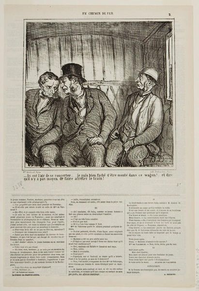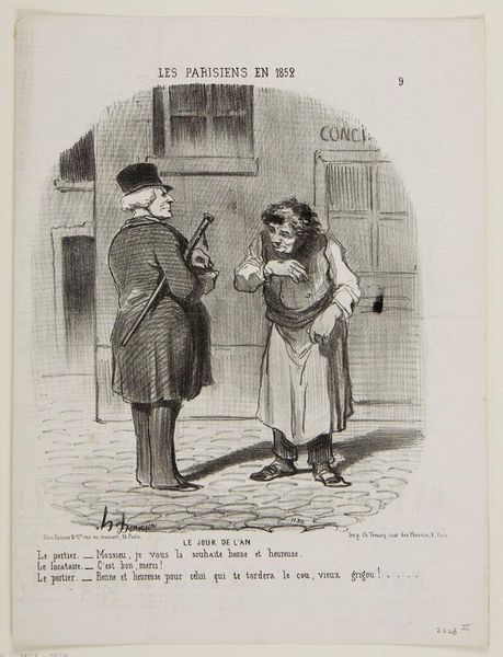 Editor: This lithograph is by Honoré Daumier; the title translates to "May I introduce my son Thèodule...". I'm struck by the satirical, almost grotesque characterizations. What does it tell us about the society of the time? Curator: Daumier, through his lithographic process, mass produced these images for consumption by a growing urban audience. The exaggerated features critique the emerging bourgeoisie and their social ambitions. Consider the materiality of the print itself—a relatively inexpensive medium used to lampoon the values of a rising class. Editor: So, the medium itself is part of the message? Curator: Precisely! The accessibility of printmaking allowed Daumier to reach a broad audience, commenting on the social dynamics of labor and class through accessible means. We are implicated as consumers of this critique. Editor: That's a fascinating perspective – the print as a commentary on its own consumption. Curator: Indeed. Thinking about art beyond its aesthetic value and considering its means of production and distribution truly unlocks its deeper cultural significance.