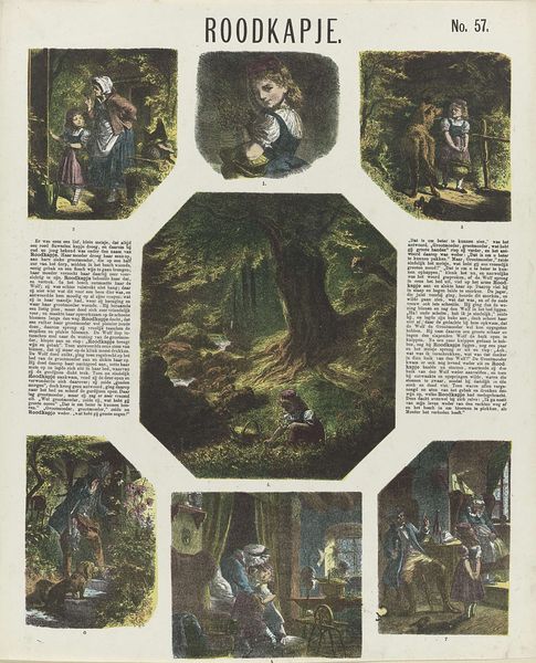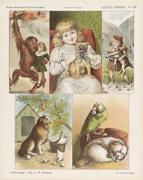 This is a delightful lithograph, "Onze Huisvrienden," by De Ruyter & Meijer, showcasing domestic scenes of cats and dogs. The composition is neatly organized, with vignettes framed like snapshots on a page, creating a narrative structure of domesticity. Observe how the artists use symmetrical arrangements in the upper register with cat portraits flanked by foliage. This contrasts with the more dynamic, asymmetrical grouping of cats interacting in the central panel, evoking the liveliness of household pets. The warm tones in the dogs' scene below ground the image, yet the animals are neatly organized into a clear separation of foreground and background. The artists employ visual cues to instill values of loyalty and protection, using conventional animal imagery to impart cultural values about home and family. The graphic style, with its crisp lines and defined forms, reflects a formal approach to sentimental subjects, a cultural statement reinforcing societal structures and values through familiar imagery.