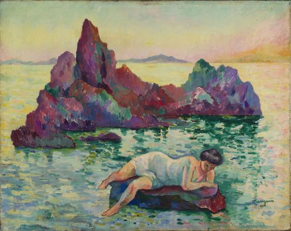 Editor: John La Farge's "A Bridle Path in Tahiti" features a figure on horseback along a coastline. The lush greenery and open composition feel very inviting! How do you approach a piece like this? Curator: It's vital to consider La Farge's process. He traveled extensively, and his landscapes often exoticized locales for a Western audience. What materials did he employ? The brushstrokes, the pigments... all contribute to a constructed vision of Tahiti, divorced from the labor and social realities. Editor: So, it's less about the scene itself and more about how La Farge made and presented it? Curator: Precisely. Examining the materials and the means of production reveals the power dynamics inherent in representing another culture. Editor: That's fascinating. I'll definitely look at it differently now, focusing on the 'how' as much as the 'what'. Curator: Good. Understanding the material conditions and production methods provides a much richer understanding of the artwork.