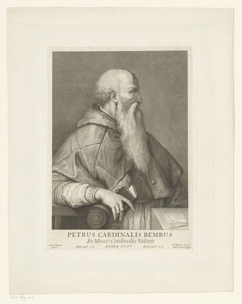Editor: Here we have Bernard Picart's 1722 engraving, "Portret van Nuno Álvares Pereira, in habijt," at the Rijksmuseum. The figure has this profound solemnity; it's echoed by the objects around him: a crucifix and a framed image of Mary. What stands out to you in this piece? Curator: Well, for me, the real story here lies in the process. Look closely at the engraving technique; the labor involved in creating those fine lines to replicate such texture! Consider the social context: prints like these weren't just art objects. They were commodities, produced and consumed, circulating images and ideas widely. It served as propaganda and dissemination. Editor: I see what you mean. I was initially focused on the spiritual elements, but thinking about it as a mass-produced object changes things. Curator: Exactly! It makes you think about the systems that allowed it to be made – the patronage, the distribution networks, the access to materials, and the skills acquired by Picart. How does this challenge the boundaries we traditionally set between high art and, say, craft or even propaganda? Editor: So it's not just about *who* is depicted, but *how* and *why* this image was produced and circulated that gives it meaning? The economic background of art production in early eighteenth century... Curator: Precisely. Look at how the lines create shadows and highlights, consider the kind of labor necessary. The texture and value! It's really an index of both piety *and* industry, right? What can we say then, of this marriage of craft, materiality, devotion and commercial viability in the making of art? Editor: Thinking about this piece as an object with production history gives me a whole new perspective. Thanks! Curator: And looking at it in this light has shifted my view as well. A fruitful way to consider the material conditions that inform art making!