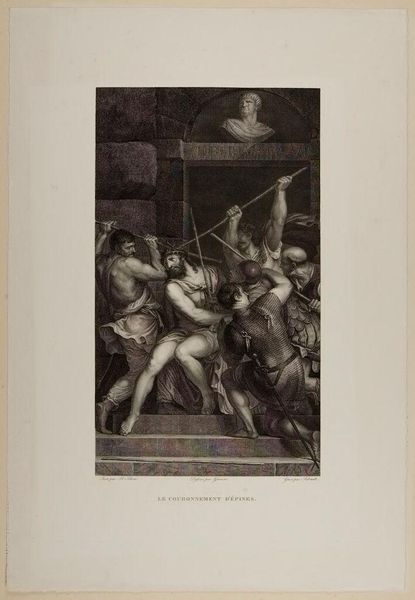 Editor: This is "Not an inch of her lovely body was spared," a mysterious print by Remi Henri Joseph Delvaux, its creation date is unknown. I’m immediately struck by the violence depicted, softened by the classical setting. How do you interpret this scene? Curator: For me, it’s a stark reminder that even beauty, idealized and enshrined, isn’t immune to suffering. It feels like a gut punch, doesn’t it? The cold, hard lines amplify the unsettling nature of the subject, almost daring us to look away, yet compelling us to witness. Editor: It does feel unsettling, yes. I suppose that contrast between beauty and violence is what makes it so impactful. Curator: Indeed. And perhaps that is the point. Art holds up a mirror, reflecting back the uncomfortable truths we often try to ignore, wouldn't you agree? Editor: Definitely. It's given me a lot to think about. Curator: Likewise. The echoes of this piece will linger.