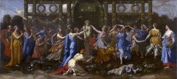 Curator: This is "Horae Serenae", painted by Edward John Poynter in 1894. It's an oil on canvas that encapsulates a fascination with classical antiquity pervasive during the late 19th century. Editor: Oh, it's like stepping into a dream of ancient Greece. The colors are so soft, almost faded, giving it a sense of timelessness. But there's also a palpable energy; those women dancing in the sunlight feel utterly alive. Curator: Precisely. Poynter was a leading figure in the academic art world, even serving as president of the Royal Academy. He drew heavily from historical and mythological subjects, imbuing them with an idealized aesthetic, intended to reflect the order and serenity believed to characterize classical civilizations. Editor: It’s fascinating how he contrasts the carefree revelry of the dancers with the more contemplative figures reclining under the pergolas on either side. Like, the party is in full swing but also suggests there’s a quieter, perhaps more profound, side to existence happening just off-center. Do you feel it? Curator: I think what you're picking up on relates to Poynter's interest in exploring the intersection of public and private life in classical societies. The juxtaposition hints at social structures, leisure activities, and idealized roles for women in that historical context. Remember that images like this played into larger Victorian societal desires and nostalgia. Editor: I guess…But for me, it's the peacocks that cinch it! They add this wild, untamed beauty, like nature gate-crashing an otherwise very orchestrated scene. A glimpse of vibrant chaos amidst the calm. And a bit tongue in cheek, no? I sense a glint of mischievousness in this supposedly serious academic piece! Curator: An interesting point! I see it as symbolic. The peacocks maybe evoke luxury, status, and even allusions to the goddesses Hera or Juno in the broader narrative of classical imagery and values circulating through art production in the 1890's. Editor: Well, whether the peacocks are slyly commenting or contributing to the intended message, they certainly lend "Horae Serenae" an enduring enigmatic quality. A sun-drenched dance of historical charm and personal interpretation. Curator: Indeed, it serves as a reminder of how artists engage with the past to construct their present, inviting endless opportunities for analysis.