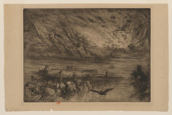 Curator: This is Félix Hilaire Buhot's etching, "The Spirits of Dead Cities." The tonality is striking. Editor: Ominous. The textures evoke a sense of decay, almost like looking at something that has eroded over time. What can you tell me about the materials used? Curator: As an etching, the incised lines hold the ink, creating the image. Notice the composition: the weight of the sky contrasts with the delicate rendering of the structures below. Editor: The process itself lends to that feeling of loss, of something being impressed and then fading. The paper's texture becomes part of the narrative. Was Buhot trying to say something about urban decline, perhaps? Curator: It is plausible. The formal relationships between the spectral figures in the sky and the ghostly city below invite such readings. The symbolic register hints at an allegory of ruin. Editor: It makes me consider the labor and skill involved, the layers of meaning imprinted through the act of creation itself. Food for thought. Curator: Indeed, a powerful meditation on ephemerality.