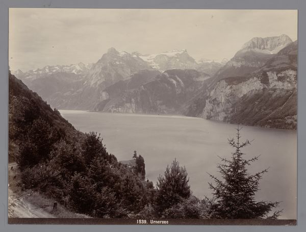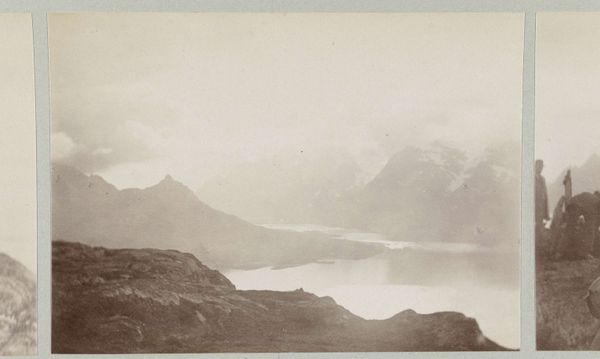 Curator: Here we have Paul Güssfeldt’s 1889 photograph, "Mountain Landscape Seen From the Water". There’s a stillness to the scene. Editor: It certainly feels calm, but almost oppressively so. The monochrome adds to that sense. You notice the heavy cloud cover pushing down, a great weight above those imposing mountains. Curator: Yes, and Güssfeldt manipulates the light to create a balanced composition. See how the dark water anchors the lower portion of the frame, mirroring the tonality in the sky. It provides a structural harmony, almost a classical symmetry. Editor: While it’s well-composed, what interests me are the materials involved. Photographic emulsion on paper; think about the specific chemical processes at play to capture this landscape. It isn't just an image; it is material evidence of time, of light hitting those specific surfaces, processed in a darkroom. Curator: Of course, there is the materiality, but I am drawn to the way Güssfeldt has flattened the perspective, the soft focus, which almost removes us from reality and edges into pictorialism. The realism tag feels at odds with such dreamlike effects. Editor: Yet those pictorialist techniques also served a specific purpose. They elevate photography by imitating painterly effects, to prove the craft was more than just a mechanical recording process. The artist is using materials to demonstrate artistry. Curator: A point well taken. Editor: Perhaps the power of the image truly lies in the tension it creates. It evokes both vastness and a certain constraint. The landscape is indeed beautiful. Curator: Precisely! An image demanding that we attend closely to formal tensions as well as considering the social position and materials of the photographer.