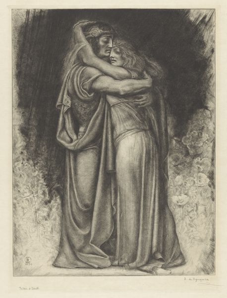 Curator: Before us is Julio Castellanos' print, titled "The Injured Eye." It seems to be a study in charcoal and pencil. The initial impression is overwhelmingly somber, wouldn’t you agree? The greyscale rendering amplifies a sense of sorrow and gravity. Editor: Indeed. The tonal range is narrow, and the dense crosshatching weighs down on the figures, intensifying the drama of their circumstance. Curator: The composition shows two figures enclosed in what appears to be a rudimentary frame. One figure is seated, head tilted back, receiving attention to the eye from a standing figure draped in fabric. Notice how Castellanos contrasts the angularity of the doorway against the softer contours of the bodies, further emphasizing their vulnerability within what should be a safe space. Editor: Right. This enclosure evokes the restrictive roles often imposed on women in particular. The shrouded figure tending to the injured eye speaks to the caretaking labor disproportionately shouldered by women, especially within the context of social and political unrest which was something common during the rise of Mexican Muralism that influenced Castellanos' practice. Curator: Yes, there's definitely an emotional undercurrent linking their bond. Note the formal arrangement—the seated figure's posture, the careful administration occurring with precision. These formal attributes build toward the scene's undeniable gravitas. Editor: This image powerfully illustrates the cyclical nature of suffering and healing, care and dependency. Is the injury literal, or does it represent an affliction brought about by social and political realities? The ambiguity is deeply unsettling. Also, it strikes me that this piece bears a certain visual similarity to religious iconography. The seated figure takes on qualities of the Passion. Curator: That's a compelling point! Perhaps we should also acknowledge that these graphic strategies also speak to similar formal themes taken up within muralism. The sharp contrasts amplify themes of loss and hope. I leave with renewed awe at Castellanos’ profound ability to translate complex ideas of suffering, gender, and history so intimately. Editor: And it reminds us that care, resistance, and vision are intertwined and often demand a collective effort toward liberation. Thank you for that thoughtful deep dive, it gave me a lot to consider about Castellanos’ “The Injured Eye.”