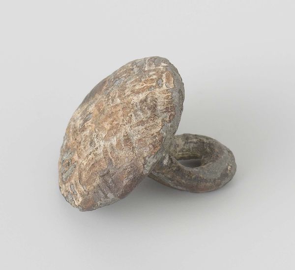 Curator: Here at the Rijksmuseum, we have a curious piece dated around 1590 to 1596. It’s called “Knoop, rond afgeplat met decoratief patroon”, essentially a round, flattened knob with a decorative pattern. The material is metal. Editor: My first thought is that it looks like it has aged remarkably, and the color scheme reminds me of old coins. Its simplicity, too, is kind of arresting, like a relic unearthed from a bygone era. Curator: It does carry that aura. These dress accessories offer a window into the aesthetics and social structures of the late 16th century. Think about sumptuary laws. What does owning such an item communicate about social status? About aspirations? Editor: Absolutely. Was this for daily use or reserved for special events, underscoring disparities in who had the means to engage with certain fashions? I'm interested in what this tells us about labor. Whose hands shaped this? Curator: Unfortunately, this piece is credited to Anonymous, so we lack definitive context of the artisan's identity. These artifacts are more than aesthetic; they reveal aspects of consumption and identity construction within certain periods of the Renaissance. Editor: And how gender dynamics come into play. Who were the primary consumers, how it was consumed? A knob like this signifies an entire system of societal stratification based on class and, inevitably, gender. The symbolism within dress always demands deconstruction, doesn’t it? Curator: Indeed. Fashion pieces become silent carriers of societal norms. A seemingly simple decorative pattern, when critically examined, is loaded with implications. It subtly reinforced hierarchy in an era undergoing intense religious and political turbulence. Editor: I wonder what conversations this object sparks today. If anything, hopefully it propels an examination of value – historical, economic, social – within these museum settings. It’s amazing what an artifact, initially seeming basic, provokes us to unpack, isn't it? Curator: Precisely. Each object, in its own way, reveals chapters of our entangled histories. I am reminded about all those individuals who may have owned similar items yet were written out of historical narratives. Editor: Let's try and not let their voices be silent.