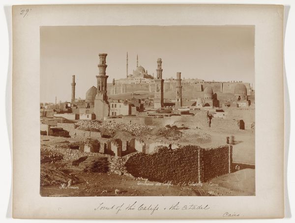 Curator: This gelatin-silver print, created between 1887 and 1897, captures a "View of the stupas around the Kuthodaw Pagoda in Mandalay, Myanmar." It’s the work of Felice Beato, part of the Rijksmuseum collection. Editor: It’s a stunningly symmetrical vista, almost dreamlike with that muted sepia palette. The sheer number of stupas is overwhelming. What stories do these monuments hold? Curator: The stupas themselves represent Buddhist principles. Each one of them contains marble slabs inscribed with teachings from the Tripitaka, the Buddhist scriptures. It’s fascinating to think about how Beato framed this intentional landscape—a human-made echo of natural forms. Editor: Yes, there is an attempt to present a kind of serene order. Given that it was produced during a period of British colonial expansion in Burma, how did images like this function in shaping European perceptions of Southeast Asia? Were they reinforcing or challenging orientalist viewpoints? Curator: I think it's likely complex. On the one hand, the orderliness may have been appealing to colonial sensibilities that valued rational organization, suggesting a kind of exotic yet knowable culture. At the same time, the grandeur might subtly communicate a civilization older and more sophisticated than simple imperial narratives allowed. Editor: The photographer has made a remarkable work in visually ordering, yet perhaps subconsciously, reflecting cultural order from its colonizers. I imagine its presentation also influenced what could be considered cultural knowledge or value. Curator: Indeed, photography played an undeniable role in creating a visual archive of the colonized world, but one cannot help but be drawn by its sheer scale of it and also consider its original purpose. Editor: Seeing it now gives us pause. The photograph preserves this place that we have the opportunity to explore through Beato's careful lens, it's as if a cultural window has been open through this careful depiction. Curator: It provides us with a poignant meditation on preservation and representation, and how these intertwine.