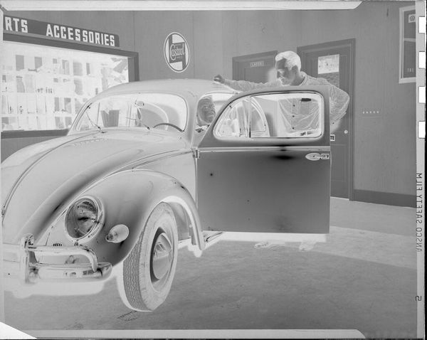 Curator: This photograph, "Untitled (two men with VW Beetle)" by Peter James Studio, presents an intriguing composition. The inverted tones create an otherworldly effect, don't you think? Editor: Indeed. The tonal inversion does make the scene appear spectral. I'm immediately drawn to the VW Beetle, a symbol of post-war industrial production. What can you tell us about its presence here? Curator: The car speaks to shifting consumer habits and the global circulation of commodities. Its presence also touches on labor and class dynamics during that era. Editor: Yes, and the composition subtly highlights the contrast between the rounded form of the vehicle and the rigid lines of the architecture, creating a visual push and pull that invites deeper reflection. Curator: Ultimately, the photograph is a great artifact, reflecting economic shifts and the evolving cultural landscape. Editor: And formally, the tonal manipulations guide us toward new interpretations, challenging traditional notions of representation and perception.