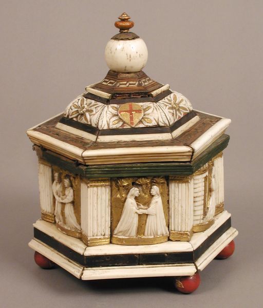 This still bank, titled "Columbia", was created by the Kenton Hardware Manufacturing Co. The bank's architectural form, complete with a domed roof and classical details, speaks of stability and permanence. Its monochrome palette accentuates the object’s structure; the use of cast iron gives the bank a solid, weighty presence, evoking notions of security. The architectural style can be interpreted as a signifier of American ideals of democracy. It functions as a symbol of institutions designed to safeguard and manage collective resources, while also prompting reflection on the relationship between commerce, governance, and cultural values in shaping societal structures. Note the signs of wear which suggest a tension between its intended symbolic representation and the reality of its use. This introduces an important element, destabilizing any fixed interpretation and adding a rich layer of cultural commentary.