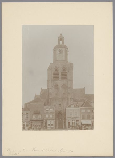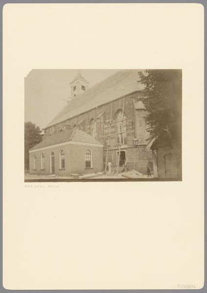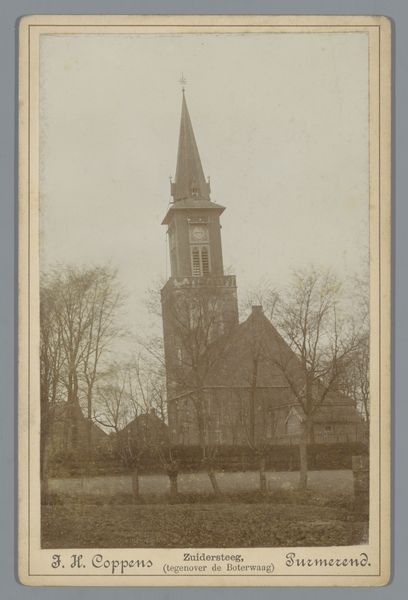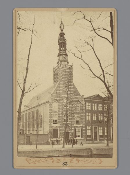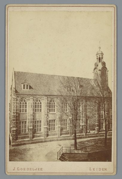 Curator: Let’s turn our attention to "Gezicht op de Sint-Petruskerk te Leiden," a gelatin-silver print created by Jan Goedeljee, sometime between 1879 and 1915. Editor: Ah, a cityscape bathed in sepia tones! It has this lovely, slightly melancholic feel, like a memory fading at the edges. Curator: Indeed. Goedeljee's choice of the gelatin-silver process contributes to that very effect, producing fine detail with subtle tonal variations. The Petruskerk was, and remains, a significant landmark in Leiden. Capturing it connects Goedeljee to the established traditions of topographic views and the photographic documentation of civic architecture. Editor: You know, despite the somber tone, there's a sense of grounded solidity. The church almost seems to grow organically from the earth, anchored by those stark, leafless trees. Do you feel how the architectural structure interacts with nature? The photograph becomes this still point between built human history and continuous life. Curator: Absolutely. Consider the social context of late 19th and early 20th century photography, where cityscapes often functioned as affirmations of civic pride and progress. Yet, by imbuing it with this evocative tonality, Goedeljee transcends a simple record and hints at something more, a kind of romantic contemplation. Also consider, perhaps, the political neutrality of religious imagery within a deeply divided society. Editor: Yes! It’s almost as though he captured not just a building but also a feeling—a quiet respect for history and a gentle acknowledgement of the passage of time. It makes me consider our relationship to the monuments that surround us. How can a photograph encapsulate so much unsaid? Curator: Exactly. And within a wider art history narrative, photography was still gaining respectability as a legitimate artistic medium during Goedeljee’s active period, it struggled to achieve the same prestige of more “accepted” methods of making. But what’s clear here is, Goedeljee saw the inherent art form embedded in the mechanical arts. Editor: He created a document and an expression, all in the same instant. Seeing it has that lingering effect—what will remain, and what stories can photography breathe back to life? Curator: It is a rather intriguing and haunting image isn’t it? Thanks for sharing those personal observations! Editor: My pleasure. What an insightfull conversation, thanks for all your input and for expanding on mine.