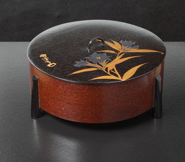 Editor: So, here we have a “Small Box with Country House,” dating from the 1920s by Kamisaka Sekka, housed here at the Minneapolis Institute of Art. The box seems to be made of wood and tempera, and depicts an idyllic scene, perhaps a house in the countryside, maybe even mountains, simplified and elegantly rendered. It feels so calm, doesn't it? What strikes you about this little landscape? Curator: It whispers secrets, doesn't it? I see a distillation of Japanese aesthetics—simplicity, asymmetry, and that love of nature, all crammed onto a tiny, portable stage. Think about where something like this would have lived. It’s an intimate object, likely held, touched, and perhaps filled with treasured little somethings. Imagine the artisan’s breath held as they carefully placed each tiny iridescent piece…a universe in miniature! What story do you think the artist might be telling? Editor: Well, I’m drawn to how Sekka combines such different materials to create texture. Like the rough mountain contrasted with the sleek lacquer. Could the mountain be symbolic? Maybe something akin to Mount Fuji in Japanese consciousness? Curator: Yes! The mountain resonates deeply within Japanese art. But instead of heroic grandeur, Sekka offers something gentler, domestic, grounded. Maybe the 'country house' element domesticates that symbol, rendering something almost like a personal shrine. The blossoms seem to cradle the image with serenity, life blooming forth despite everything, like a hopeful breath… And this speaks to something universal, don’t you think? Our yearnings for a quiet refuge. It feels meditative. Editor: I do, I see that now, all the textures and techniques point toward meditation and the quietness of that place. It gives such a lovely perspective into Sekka’s mindset and time. Thanks! Curator: My pleasure! It is amazing what stories a box can hold. Both literally and figuratively.