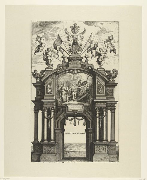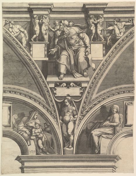 This is a print made by Cherubino Alberti around 1600, depicting a portion of Michelangelo's ceiling in the Sistine Chapel. It’s created using the etching process, where lines are incised into a metal plate with acid, then inked and pressed onto paper. The material qualities are intriguing. Unlike Michelangelo’s vibrant frescoes, Alberti's print reduces the scene to a network of lines, playing with light and shadow. The linear quality emphasizes the incredible labor involved in both Michelangelo’s painting, and Alberti's printmaking. Consider the skill required to translate the dynamic, colorful figures into a monochrome, two-dimensional format! The print serves as a kind of document, recording and disseminating Michelangelo’s masterpiece. It makes the Sistine Chapel accessible to a wider audience through the reproductive power of printmaking. In this way, Alberti's work blurs the lines between original artwork and reproduction, fine art and craft, highlighting the value and complexity of both.
