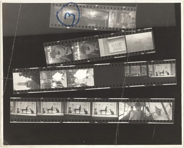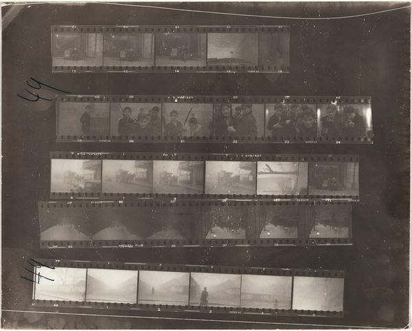 Curator: At first glance, I see what looks like discarded film strips—fragments of images layered in monochrome. There's a haunting quality to this rawness. Editor: Today we will discuss “Wales 47,” a gelatin silver print created by Robert Frank in 1953. The piece comprises several strips of film negative. Curator: The layering presents an almost cinematic narrative, even though we’re dealing with still images. The starkness of the black and white emphasizes form and shadow. Notice how each individual frame teases a story. Editor: Indeed. What we observe here is an arrangement that seems both accidental and carefully structured. Frank’s process, particularly the editing stage, played a crucial role in shaping perceptions and interpretations of the scenes. There’s a tension between spontaneity and control here. Curator: Looking closer, there's also a thematic contrast between each set of frames—there is some food displayed rather prominently on top of images portraying people. Editor: Frank sought to capture life as it was experienced, diverging from established documentary norms. The rawness in his prints, the sometimes harsh contrasts, served a purpose. He presents the reality of a society marked by inequalities. Curator: So, the imperfections become crucial to the impact. The arrangement encourages me to consider what has been included, but also excluded. What might he have intentionally left on the cutting room floor, and what significance might that carry? Editor: Absolutely. In the context of the 1950s, this type of street photography challenged idealized representations and instead depicted more grounded scenes of everyday existence. Robert Frank gave prominence to realities not typically portrayed by mainstream media. Curator: This discussion has enhanced my appreciation for the tension and layers that Frank explores within “Wales 47." Editor: I hope listeners also understand the way in which Robert Frank provided an aesthetic framework and also a stark political observation about mid-century Wales.