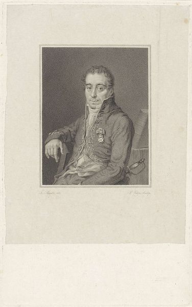 Curator: This engraving, titled "Stephen Decatur," was created by Asher Brown Durand in 1835. The print portrays its subject in a formal military jacket, grasping a sword. What stands out to you initially? Editor: A certain rigidity, a formality verging on austerity. He appears posed, almost unyielding. I wonder about the narratives being projected. Is he an exemplar, a warning, or something else entirely? Curator: Decatur was indeed a celebrated naval officer. Examining Durand's piece through a socio-political lens, the classical column in the background becomes less a mere architectural element and more an emblem of the ideals America aspired to. The image of a military hero upholding an empire’s principles. Editor: It's difficult to separate the man from the moment, isn't it? Decatur, the war hero, became also the figure that played into issues of patriotism, white masculinity, and expansionism. Who was this Stephen Decatur to diverse populations beyond the narrative of his celebrated victories? Curator: Durand was clearly working within certain academic traditions. Neoclassicism emphasized order and reason. Notice how meticulous the engraving is. It conveys a sense of authority. Durand likely intended to craft a representation of Decatur suitable for historical memory, even if that meant eliding complexity. Editor: Absolutely. These portraits and others often functioned as endorsements of specific power structures. We should always question whose stories were being told and who remained silenced in these visual records. Looking back through today's perspectives, it gives us the opportunity to reveal narratives and truths absent from initial commissions. Curator: It really makes you think about the lasting power of an image. The dialogue surrounding portraits like this one reveals an evolution in values and expectations. Editor: Precisely. The narratives constructed back then— and the silences surrounding them—have palpable reverberations even today. It is about re-evaluation and understanding both context and impact.