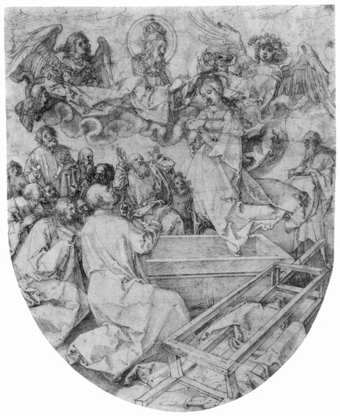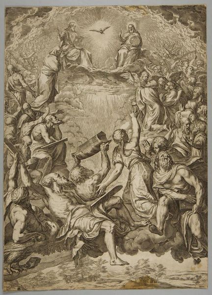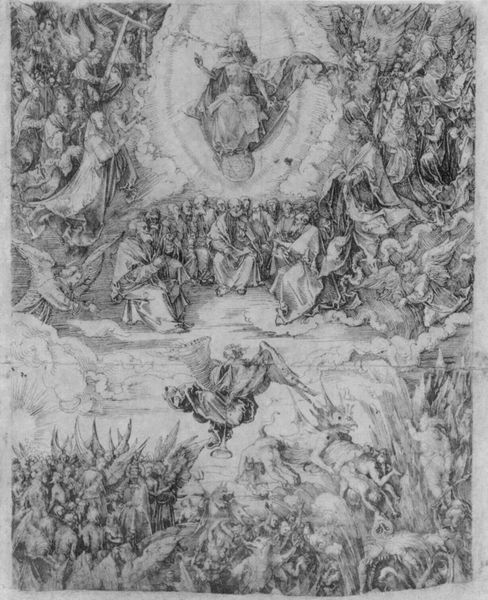 This section of the engraving 'Resurrection of the Dead' by Niccolò della Casa is held at the Metropolitan Museum of Art. It is made with black ink. Notice how the composition emphasizes a spiraling movement, with figures densely packed and intertwined. This creates a sense of dynamic chaos, mirroring the apocalyptic theme of the Last Judgment. Della Casa masterfully uses the contrast of light and shadow to define the musculature of the figures. The bodies are stacked in a hierarchy, suggesting different levels of salvation or damnation. The artist uses linear perspective and foreshortening. It adds depth and realism while also serving to disorient the viewer. The careful rendering of anatomy, and its relationship to the overall message of divine reckoning, all underscore the engraving's engagement with themes of salvation, damnation, and the ultimate fate of humanity. The dramatic use of line and form destabilizes any fixed interpretation of religious doctrine, instead inviting reflection on the complex interplay between faith, judgment, and human destiny.
