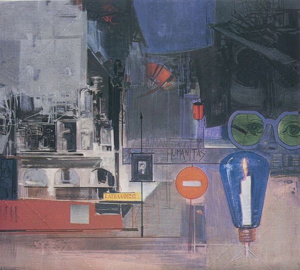 Alekos Kontopoulos painted this work, "Synthesis," layering geometric forms and muted colors, almost like he's building a world from scratch. There's a real joy in the making of it. Looking closely, the texture is key; see how the paint isn't trying to hide, but lets you in on the process? The surface has this kind of gritty feel, and you can almost see the individual strokes that Kontopoulos made. The translucent reds and greens bleed into the grays. Notice the sphere on the lower-left, how it seems to both float in front of, and become part of, the grid behind it? It’s all about the push and pull. It makes me think of early Cubist painters like Braque, or even the later, more architectural works of de Kooning, who were similarly smashing together forms and ideas. Ultimately, though, "Synthesis" is its own thing, an ongoing conversation between the artist and the canvas.